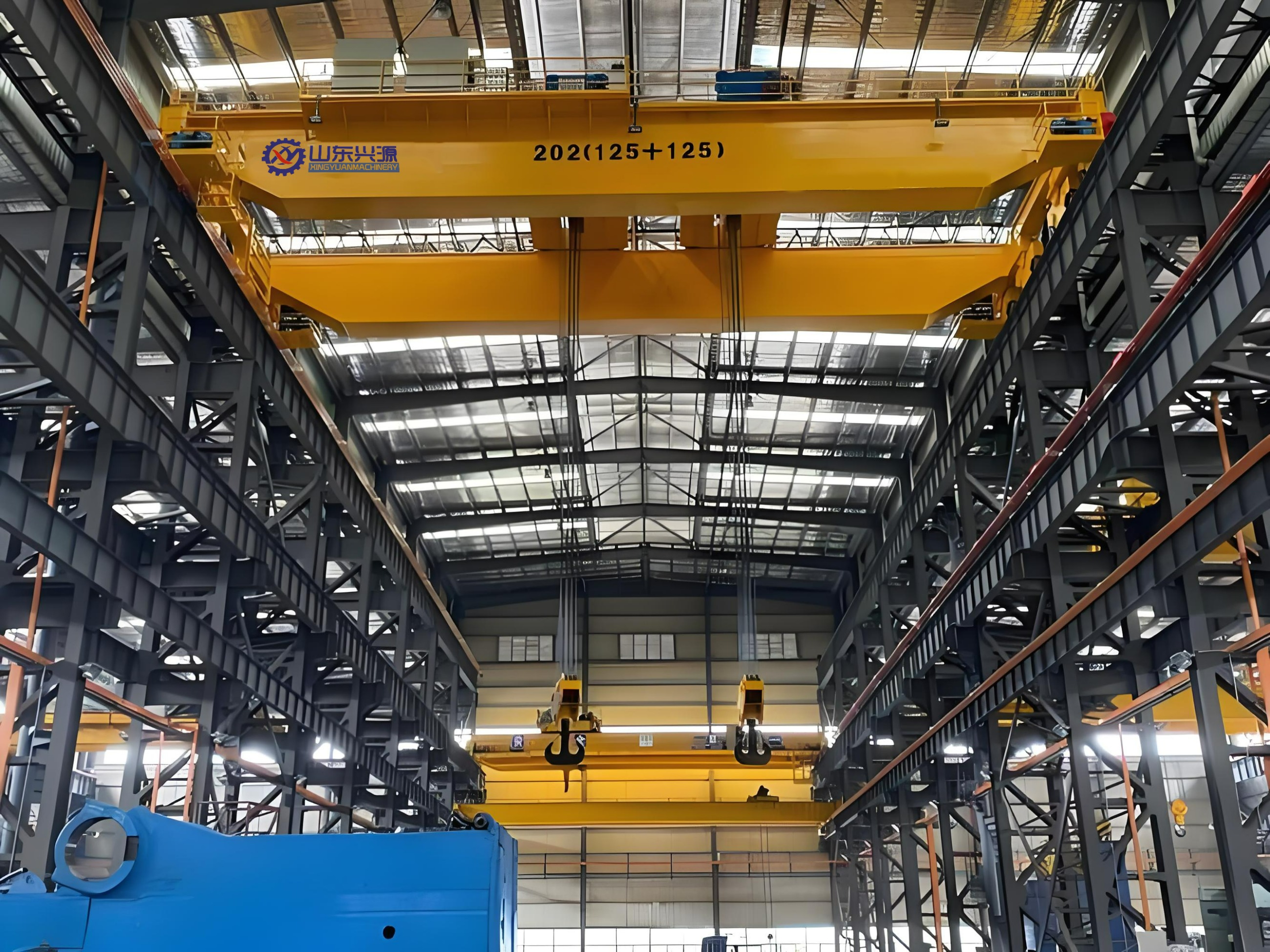 ?是在QD型橋式起重機(jī)的基礎(chǔ)上,將單小車改為雙小車,可單鉤獨(dú)立或雙鉤同時(shí)吊運(yùn)物件,主要由橋架、大車運(yùn)行機(jī)構(gòu)、小車、電器設(shè)備等組成。